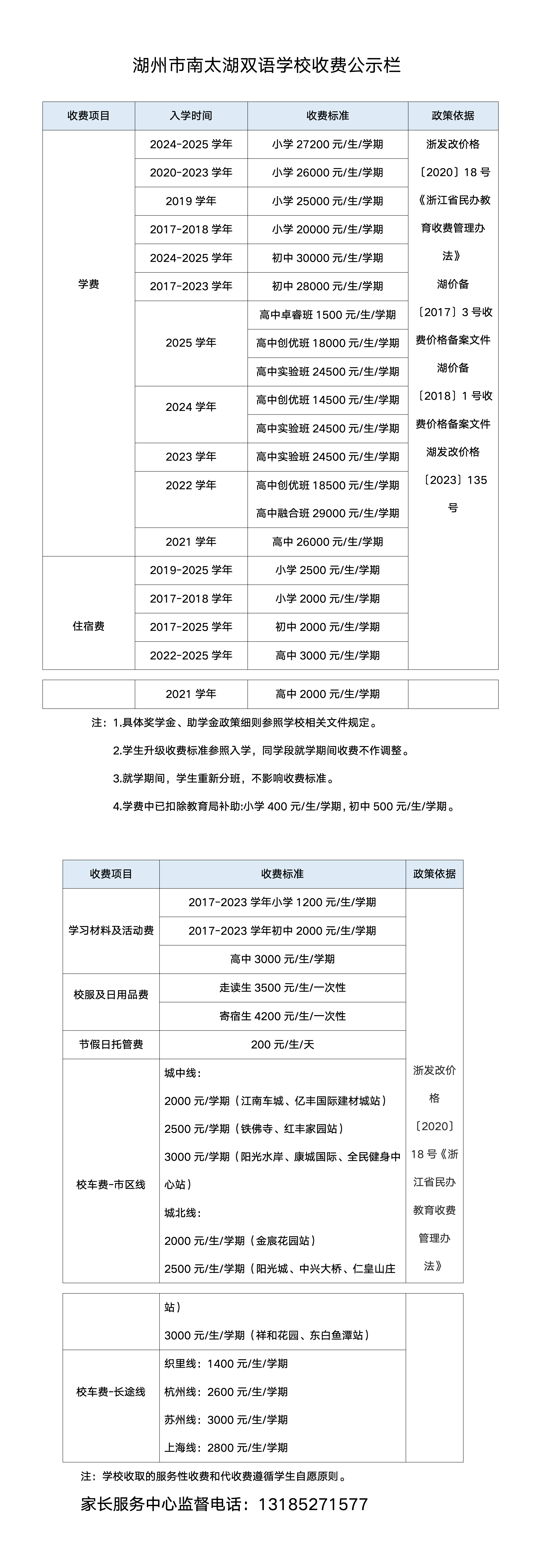 湖州市南太湖双语学校高中收费公示栏